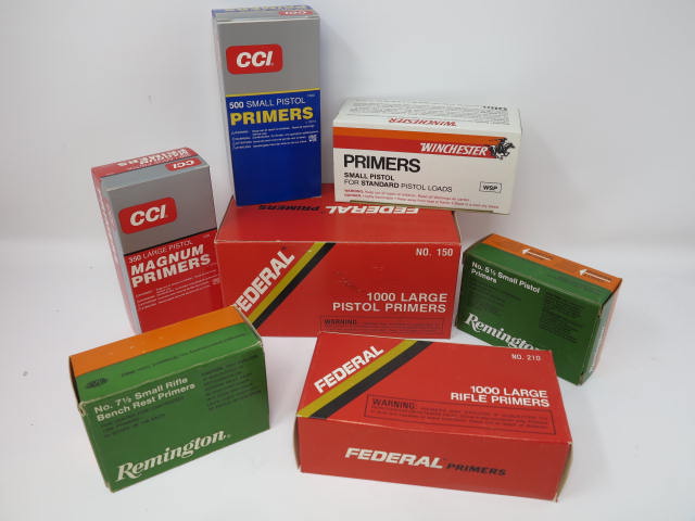 20,000 Primers for Small & Large Rifles and Large Pistols, Factory Ammo: 50,000 rds .22 cal. match & target, 7.62 x 39, 30 cal Carbine, .223 Remington, 30-30 Winchester, 45 ACP, 9MM, Shotgun Ammo, 8mm Mauser, 7mm TCU, 30-30, 308, and more! (2) Dillon RL 550 Reloading Machines, Lyman & Lee Reloaders, Dies, Charging Bars, 850 Lbs. Lead Bullet Heads, Bullet Molds, Die Sets & much more too much to list......